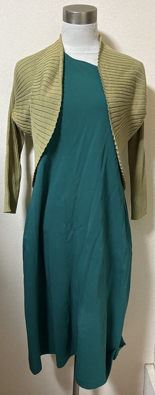 9月30日に着ていたシビラのワンピースです。グリーン系デザインネックジャージー半袖ワンピースとカーキデザインニットボレロにコーディネートを追加しました。