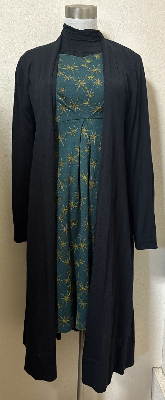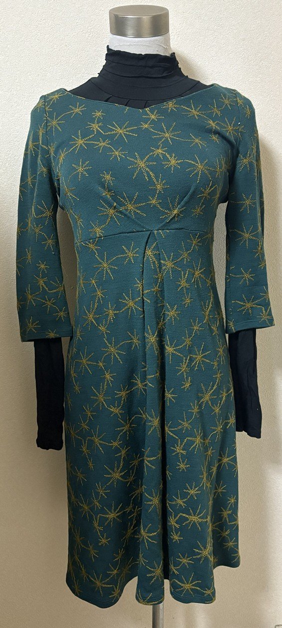 その日着ていたシビラのワンピースです。ダークボタニカル風胸絞りワンピースとダークグリーン系プリーツ入りあったかタートル長袖トップスとダークグリーンモヘヤストールにコーディネートを追加しました。