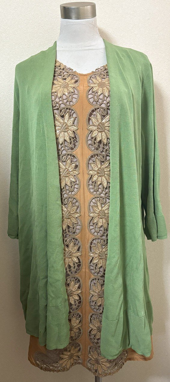 9月16日に着ていたシビラのワンピースです。スパンコールフラワー刺繍カットレースシルクコットンボイルワンピースと黄緑系サラッとロング羽織にコーディネートを追加しました。