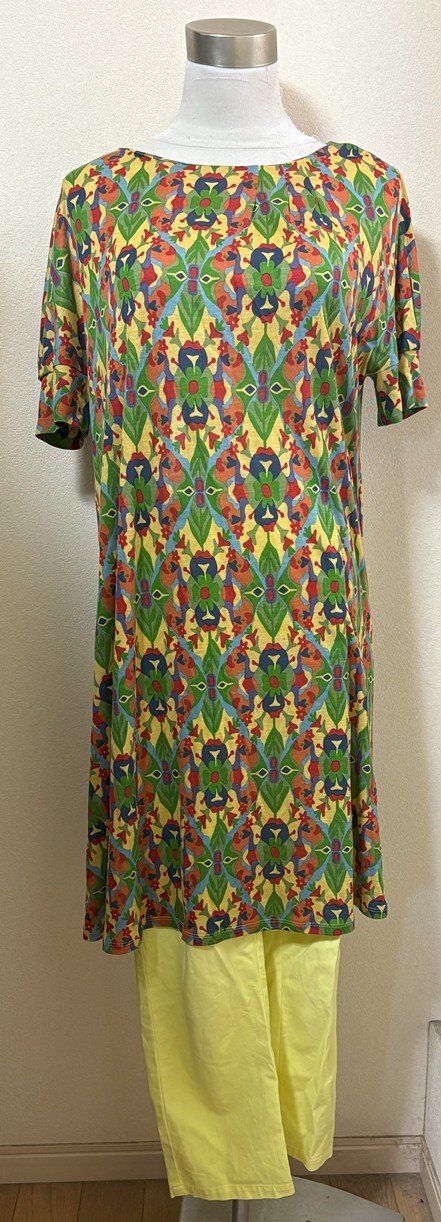 9月18日に着ていたシビラのワンピースです。花幾何学模様プリントワンピースレッド系と薄黄色系麻混夏用ゴムレギンスにコーディネートを追加しました。