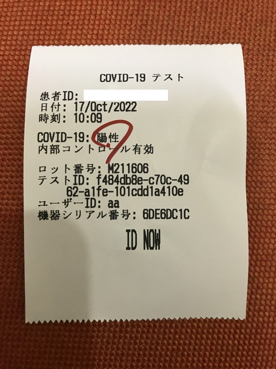 2022年10月17日(月) 朝起きたら、36.9℃。だいぶん元気になった。なので、会社に行こうと思ったが、何か違和感を感じる。発熱外来を調べたら、徒歩15分くらいのAクリニックがあり、電話したら、10時に来てくださいと。慌てて用意して、Aクリニックに行くと、病院ではなく、隣のガレージで待機。待っていたら、あと3人、明らかに体調の悪い方たちが来て、中に案内される。鼻にちょこっと綿棒をくぐらせて、ベットの部屋で4人で待機。すると、私だけ外に呼ばれる。あっ、私だけ陰性だったんだって思ったら、紙きれを渡されて、「陽性」だったのだ、、、。
