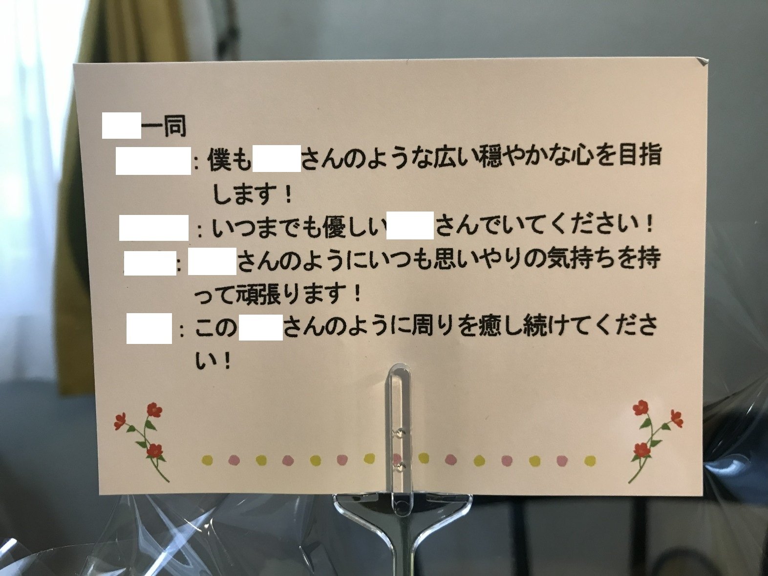 連れ合いの寄せ書きを見る。11年お世話になったので、150名の方からメッセージを頂いてた。どれ見ても「優しい」とかばかり。ウソだ!
