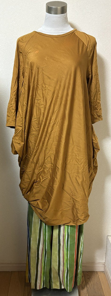 10月3日に着ていたシビラのワンピースです。アシンメトリースムースワンピースオレンジ系とマルチランダムストライプワイドパンツイエロー×グリーン系にコーディネートを追加しました。