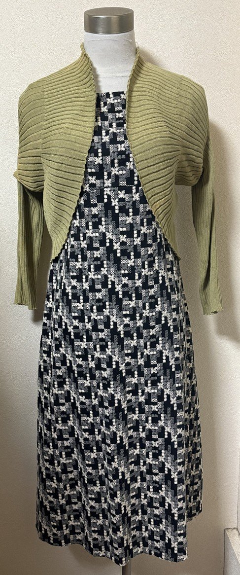 その日着ていたシビラのワンピースです。ブロック風ディテール刺繍黒ワンピースとカーキデザインニットボレロにコーディネートを追加しました。