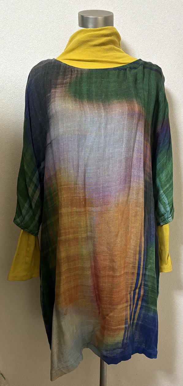 2014年秋の商品です。その前年に出た生地は、インクジェットプリントワンピースと同じ「marumasu」製です。丸枡染色でできた独特の生地で、手触りはガーゼっぽい感じで柔らかいです。両ポケットが付いていて便利です。インクジェットプリントワンピースより幅が広めでざっくりした感じで、カジュアルに着こなせるので、レギンスやパンツに合わせてチュニックとしても活用できます。グリーン系・イエロー系、オレンジ系、パープル系、ブルー系などが入ったグラデーションの色合いは、秋にピッタリで素敵です。指定外繊維(植物系再生繊維)100%。定価63,000円(税別)です。