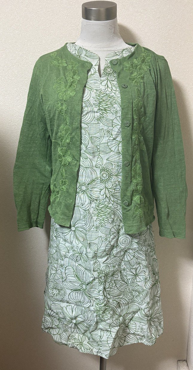 2010年ごろの商品です。2018年ごろまでシビラで、定番的な商品になってました(今は似た感じですが、別の羽織が定番になってます。)。定番なのでバーゲンにならないです。定番で、黒とベージュの展開があり、どちらも色違いの黒とベージュを持ってます。それとは別に毎年限定カラーが出て、こちらはその限定カラーです。他に赤や紫系などがありました。またロングタイプの展開が年によってありました。鈎針の模様が本当に豪華で、見ているだけで目の保養ですね。ワンピースやトップスの羽織用にとっても最適で、グリーン好きの私には、待ってましたという色目。もちろん、グリーンのワンピースに合わせますよ!レーヨン72%、ポリエステル28%。定価33,000円(税別)です。